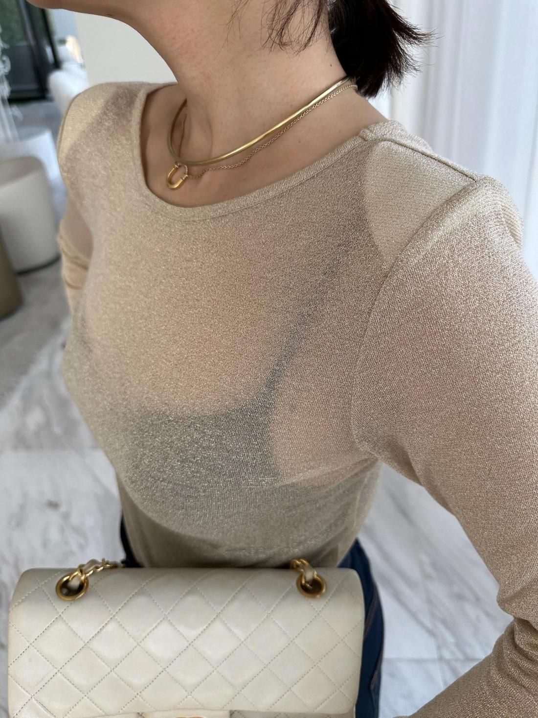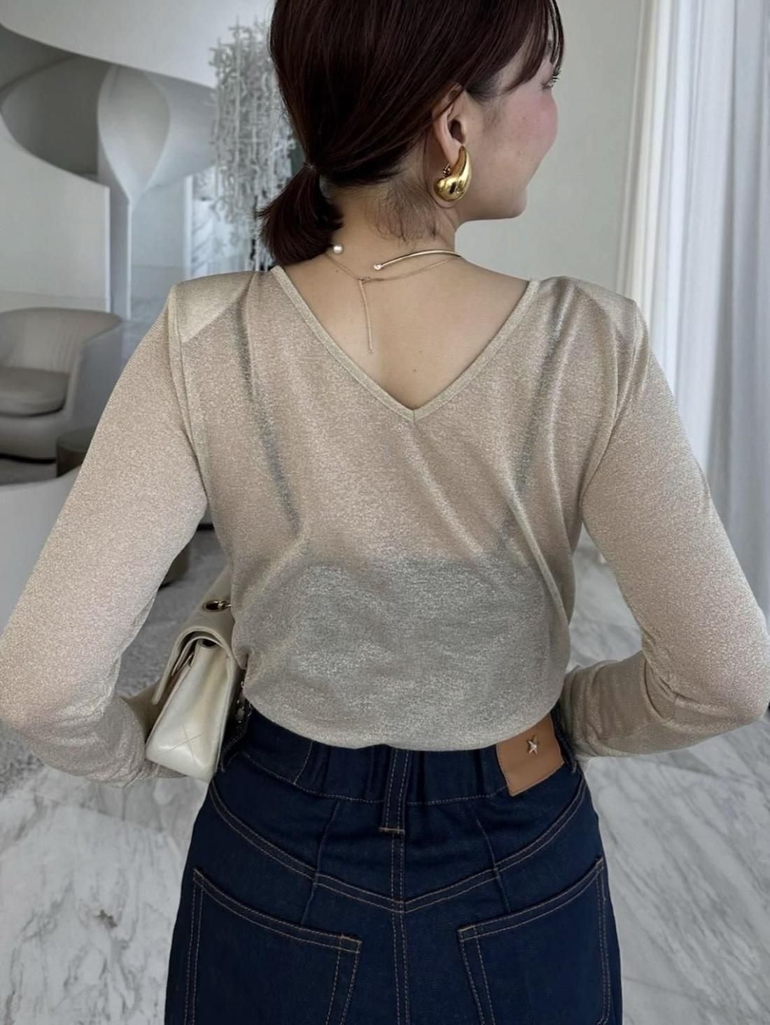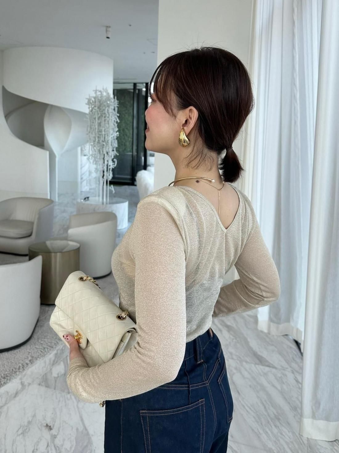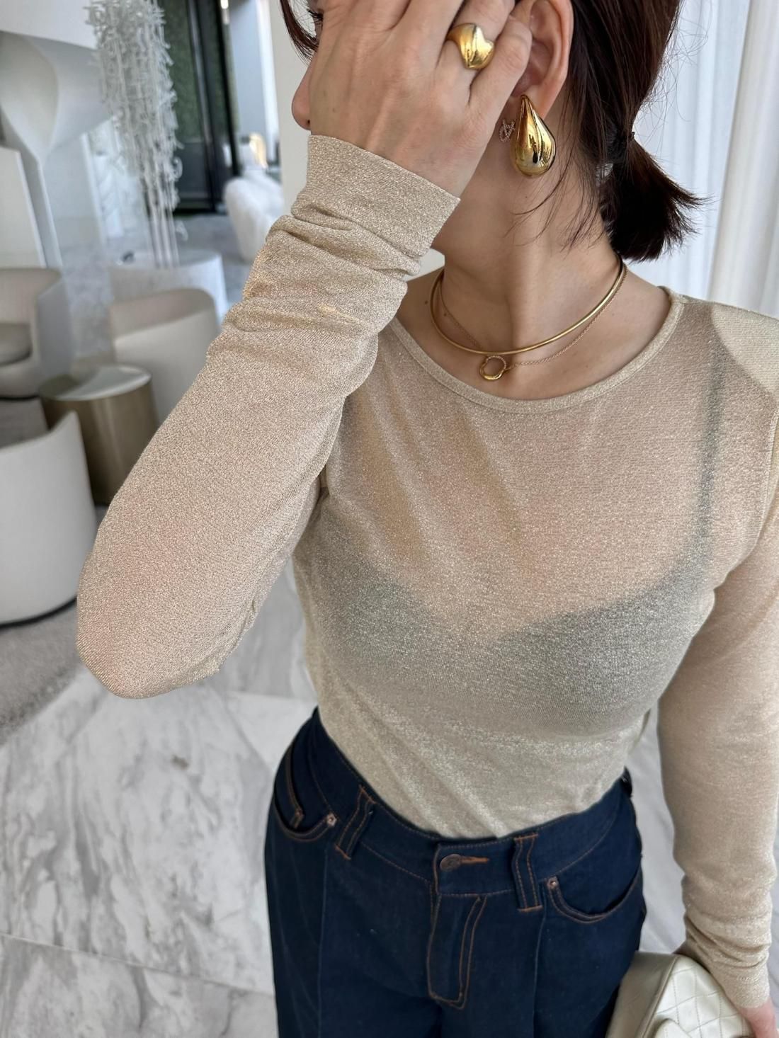 透け感のある薄手生地には、極細のモノフィラメント糸を使用したキラキラショルダーロンT。
