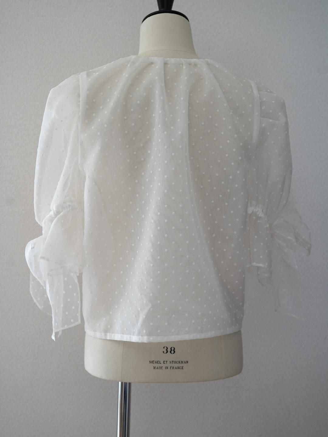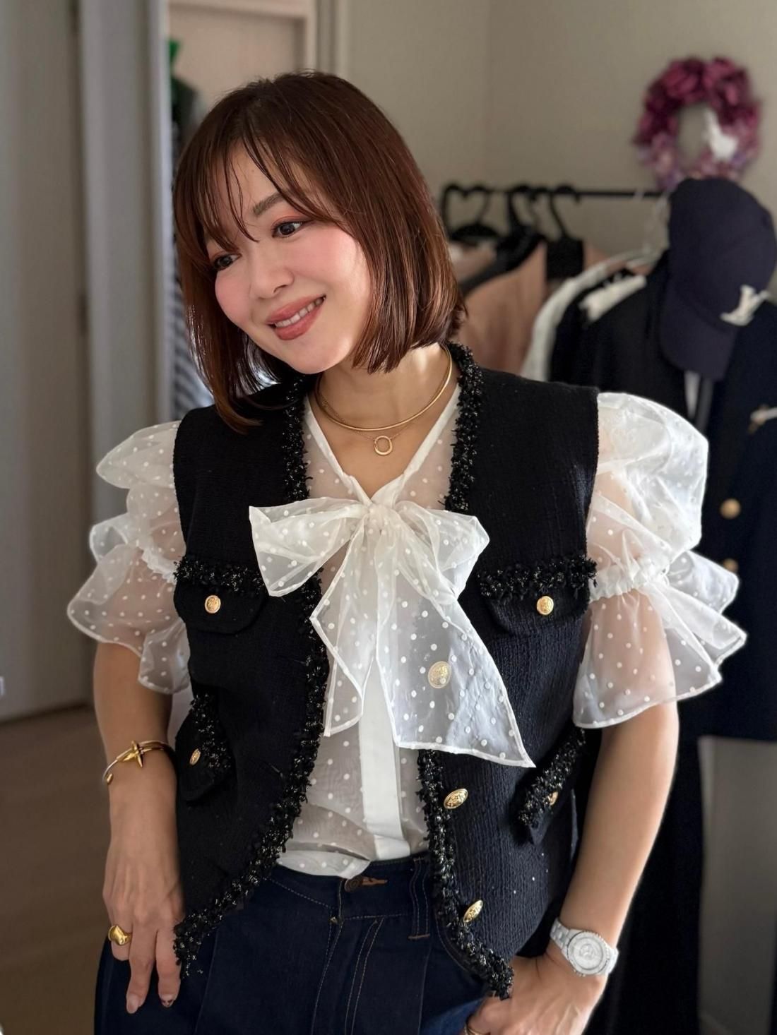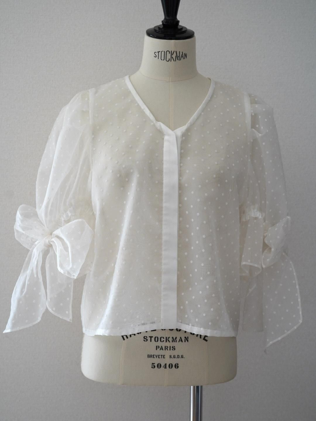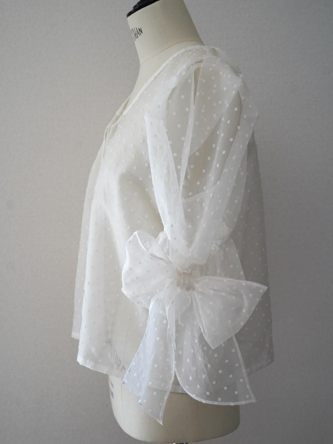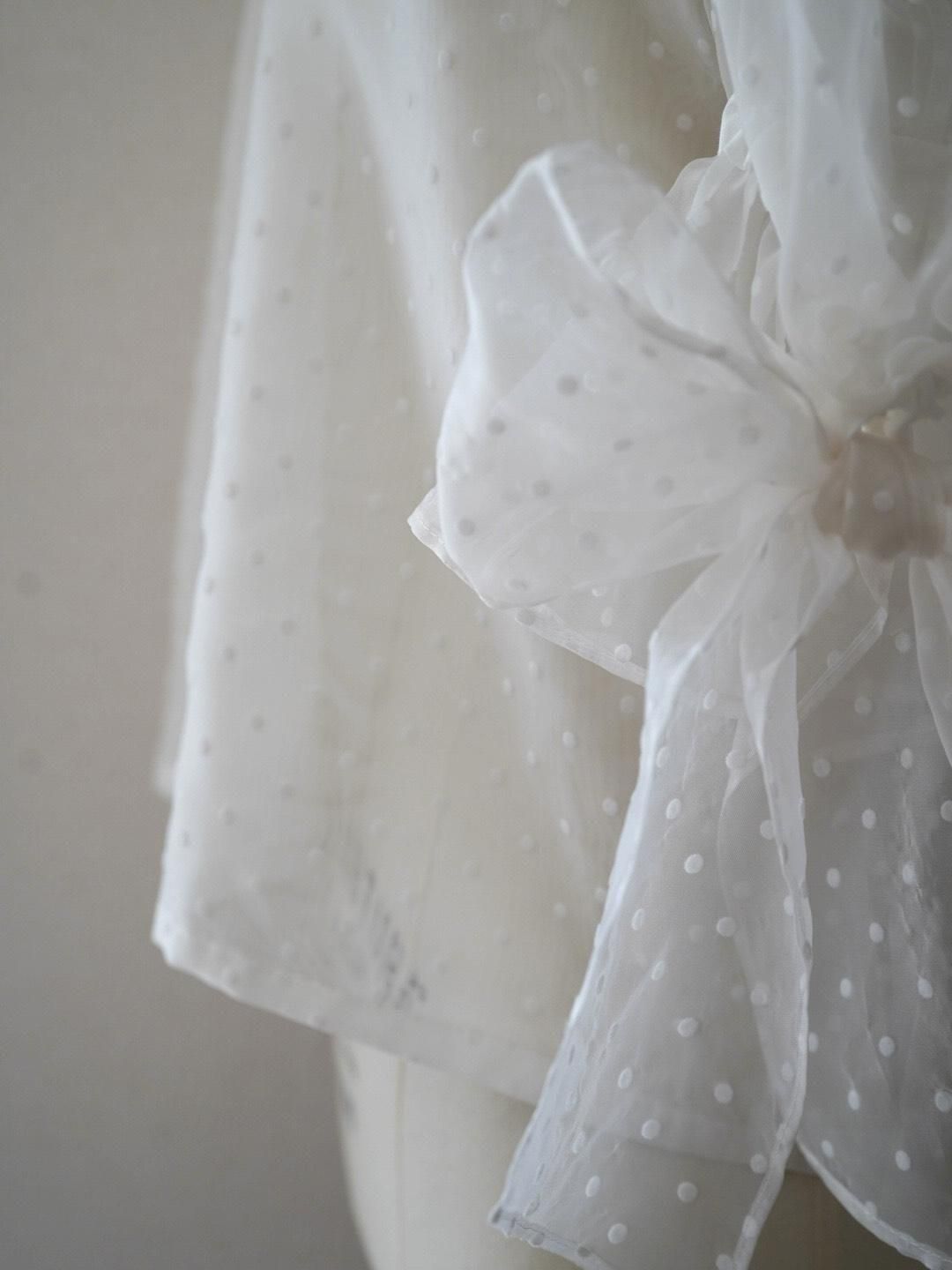付属のリボンは2本。両袖にあしらってフェミニンに、胸元のボタンホールに通してリボンやボウタイ風に、さらに首元に巻いてパリジェンヌ風に…アレンジ次第で様々な表情を楽しんでいただけます。
