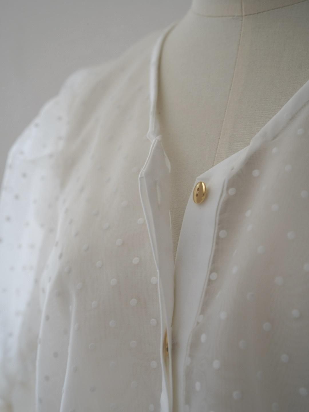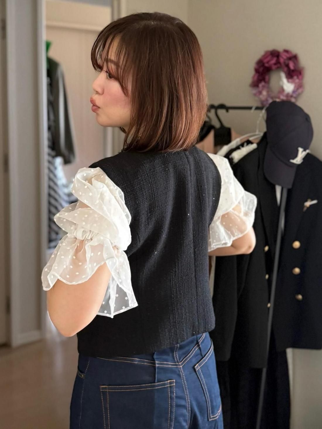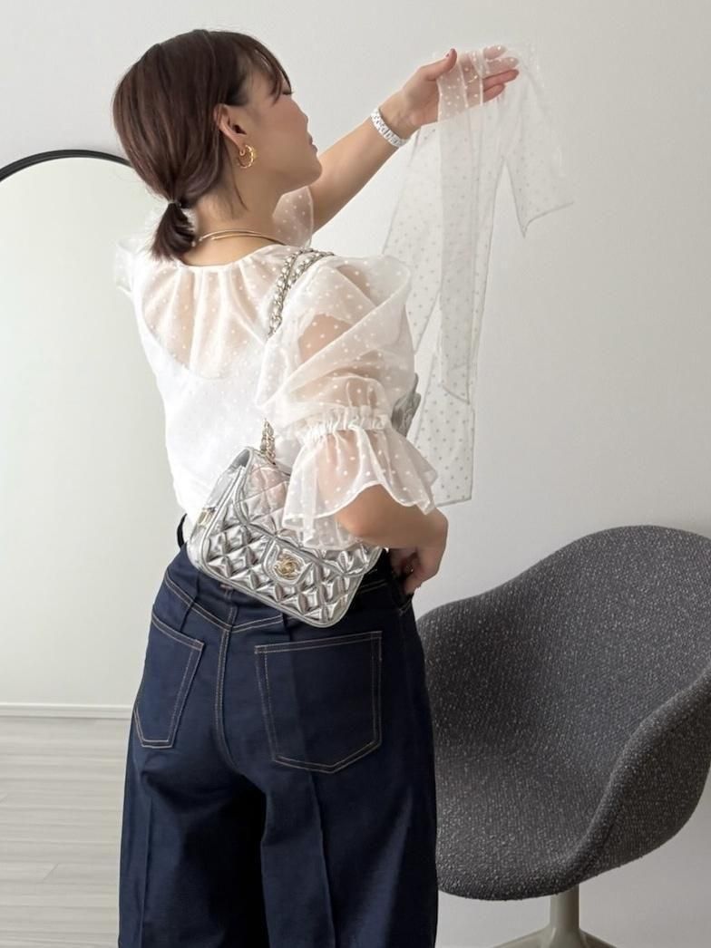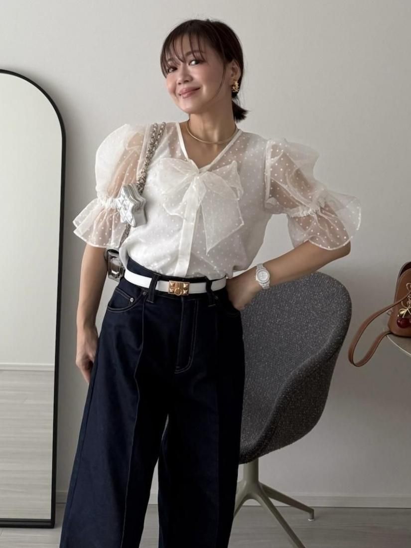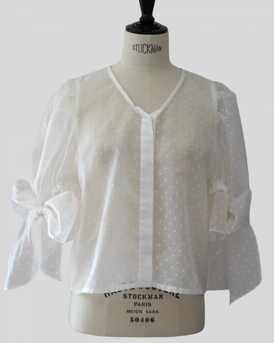 付属のリボンは2本。両袖にあしらってフェミニンに、胸元のボタンホールに通してリボンやボウタイ風に、さらに首元に巻いてパリジェンヌ風に…アレンジ次第で様々な表情を楽しんでいただけます。