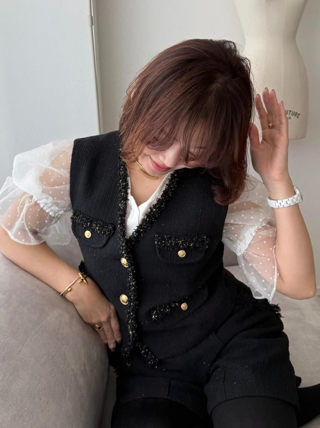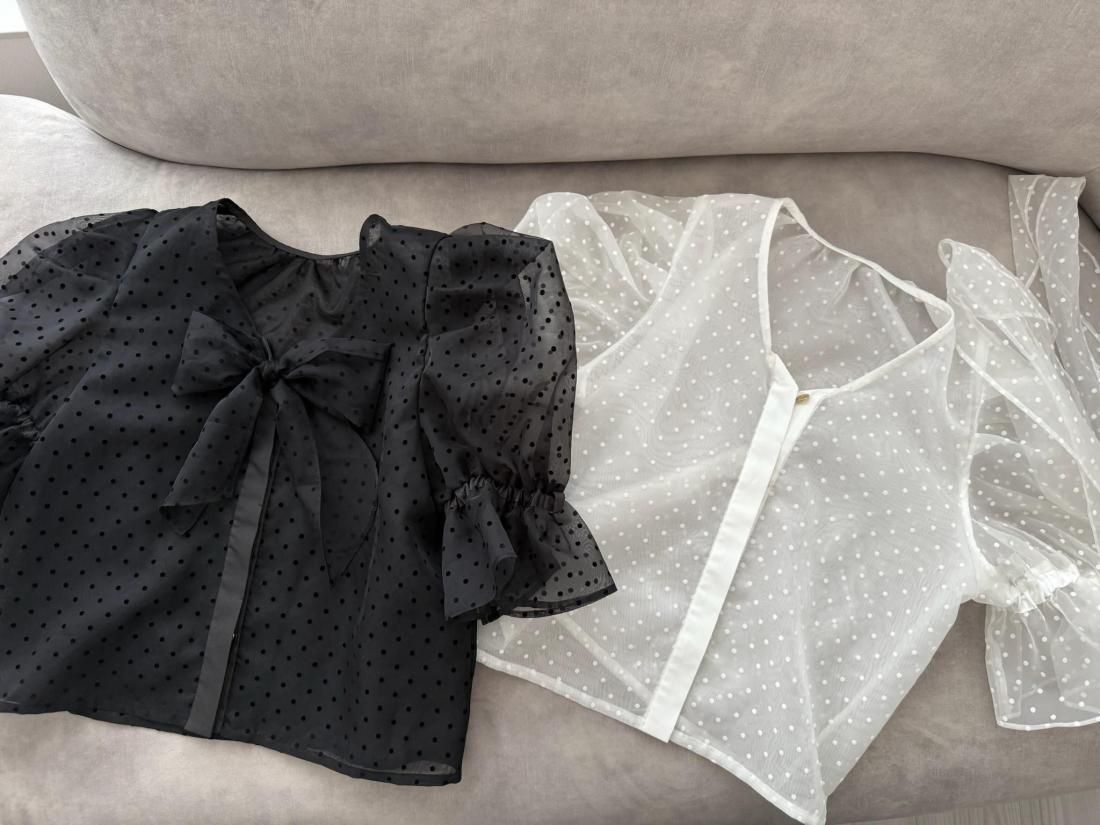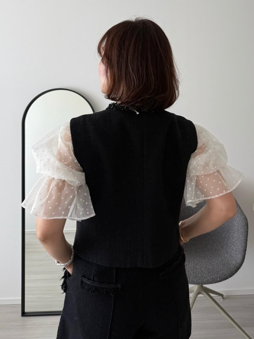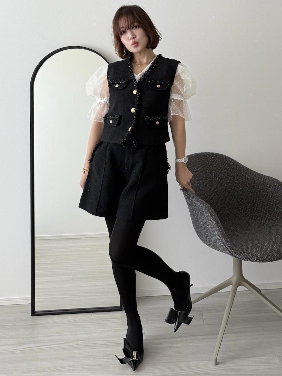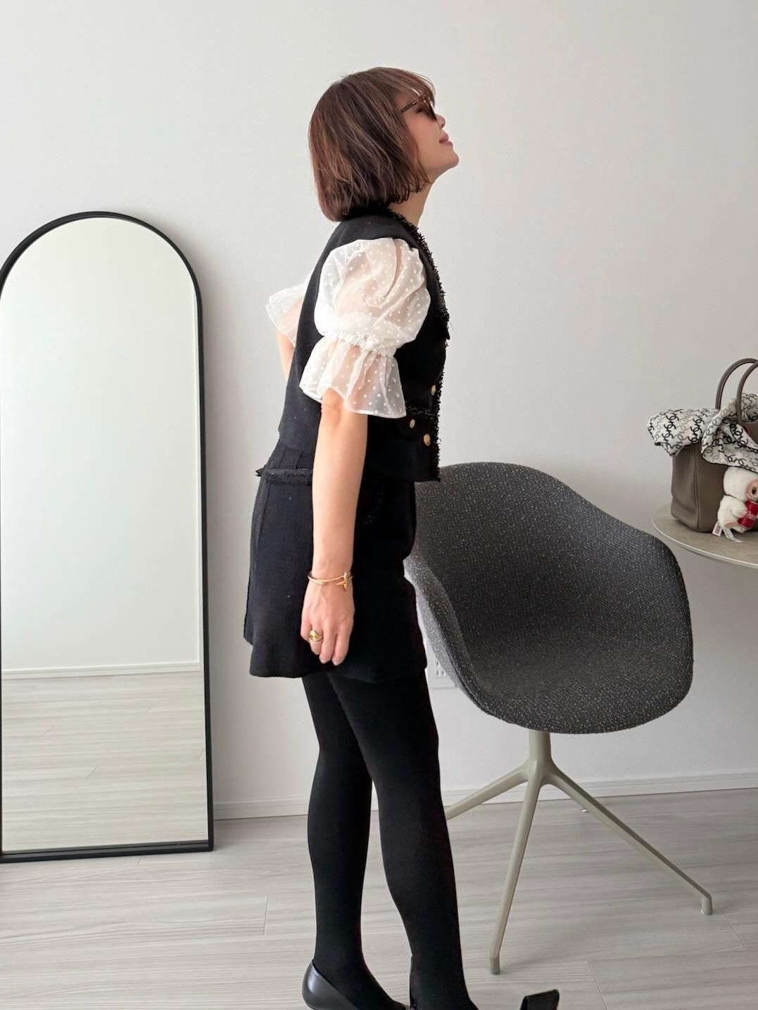 付属のリボンは2本。両袖にあしらってフェミニンに、胸元のボタンホールに通してリボンやボウタイ風に、さらに首元に巻いてパリジェンヌ風に…アレンジ次第で様々な表情を楽しんでいただけます。