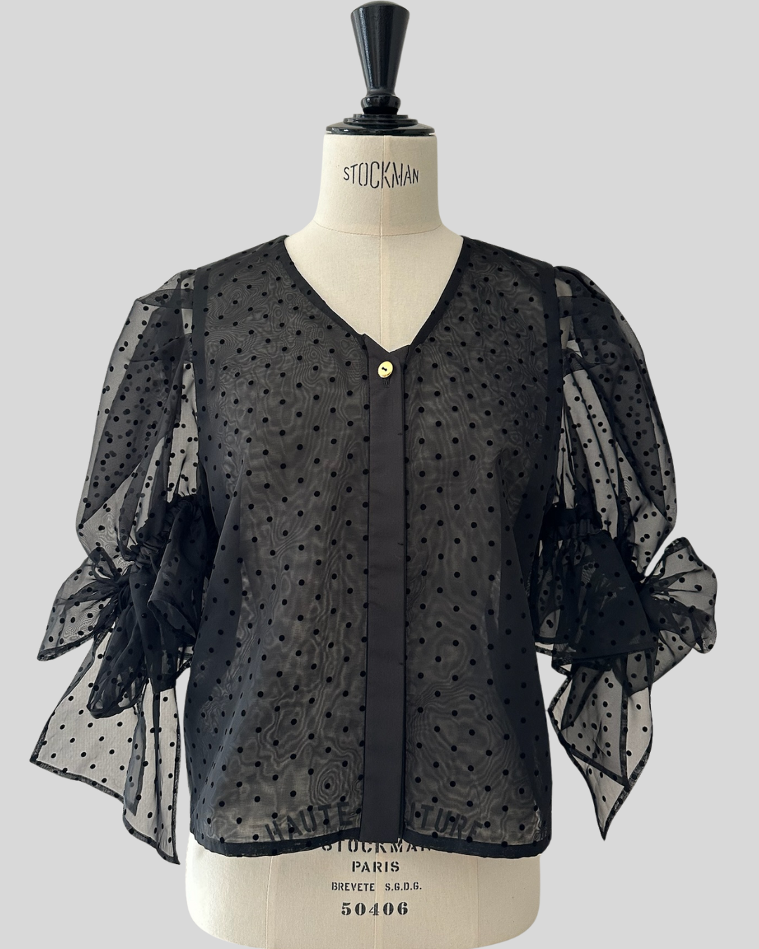 付属のリボンは2本。両袖にあしらってフェミニンに、胸元のボタンホールに通してリボンやボウタイ風に、さらに首元に巻いてパリジェンヌ風に…アレンジ次第で様々な表情を楽しんでいただけます。