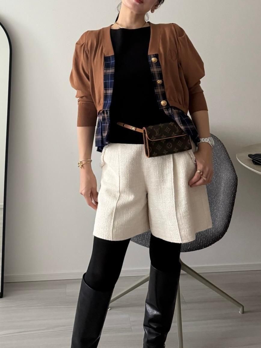 タックを効かせた短丈デザインは腰回りをすっきりと、